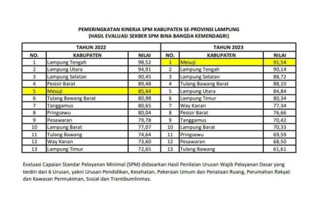 Sebelumnya di tahun 2022 Kabupaten Mesuji menduduki posisi ke-5 Standar Pelayanan Minimal kemudian meningkat menjadi peringkat ke-1 se-Provinsi Lampung pada tahun 2023.