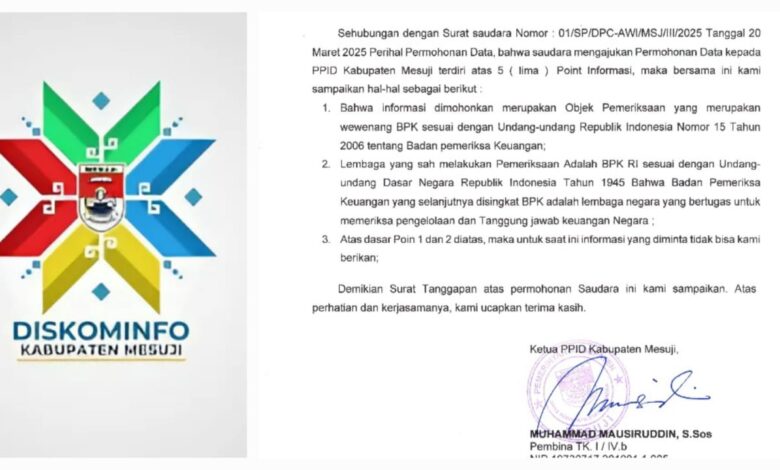 Dalam surat balasan bernomor 01/SP/DPC-AWI/MS/III/2025 yang diterima oleh Ketua DPC AWI, Diskominfo Mesuji berdalih bahwa data yang diminta merupakan bagian dari objek pemeriksaan Badan Pemeriksa Keuangan (BPK), dan oleh karenanya tidak dapat dibuka kepada publik. Dengan mengutip UU Nomor 15 Tahun 2006 tentang BPK dan UUD 1945, Diskominfo menyatakan bahwa informasi yang dimohonkan bukan menjadi ranah keterbukaan informasi publik.