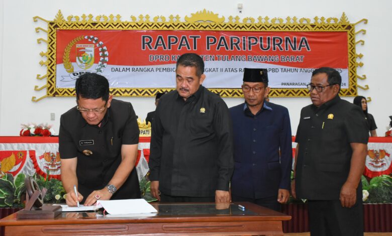 Suaratrans.com- Tulang Bawang Barat– Rancangan Peraturan Daerah (Raperda) Anggaran Pendapatan dan Belanja Daerah (APBD) Kabupaten Tulang Bawang Barat (Tubaba) Tahun Anggaran (TA) 2025 disahkan pada Rapat Paripurna DPRD Kabupaten Tubaba, dengan agenda Pembicaraan Tingkat II Atas Raperda tentang APBD Kabupaten Tubaba TA 2025. Di Ruang Paripurna DPRD setempat. Jumat (29/11/2024).